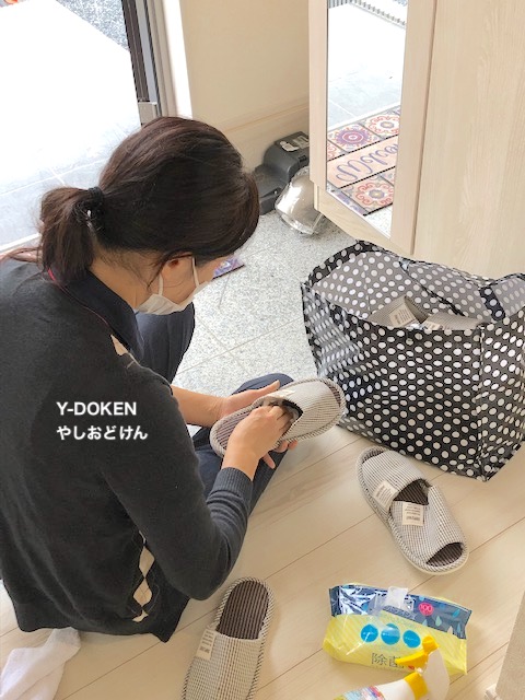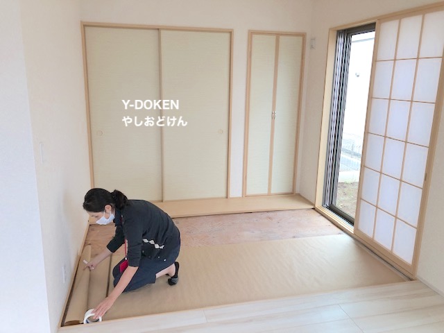 気持ちよく、お客さんに内覧して頂きたいので、室内の掃除、スリッパの除菌、和室部分に茶紙を敷きました。(和室部分は引き渡し時に畳を納入します。)
