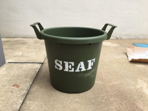 ホームセンターで600円で購入したバケツに塗装とペイントをしてヤシのプランターに↓