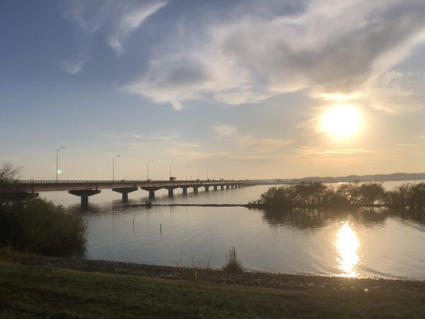 帰路は土浦方面に向かい、行方市の「道の駅たまつくり」に立ち寄り、夕日を眺めました。