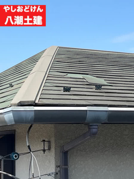 隣の家のベランダから屋根を見ると、スレート瓦が割れてズレていることを発見しました。